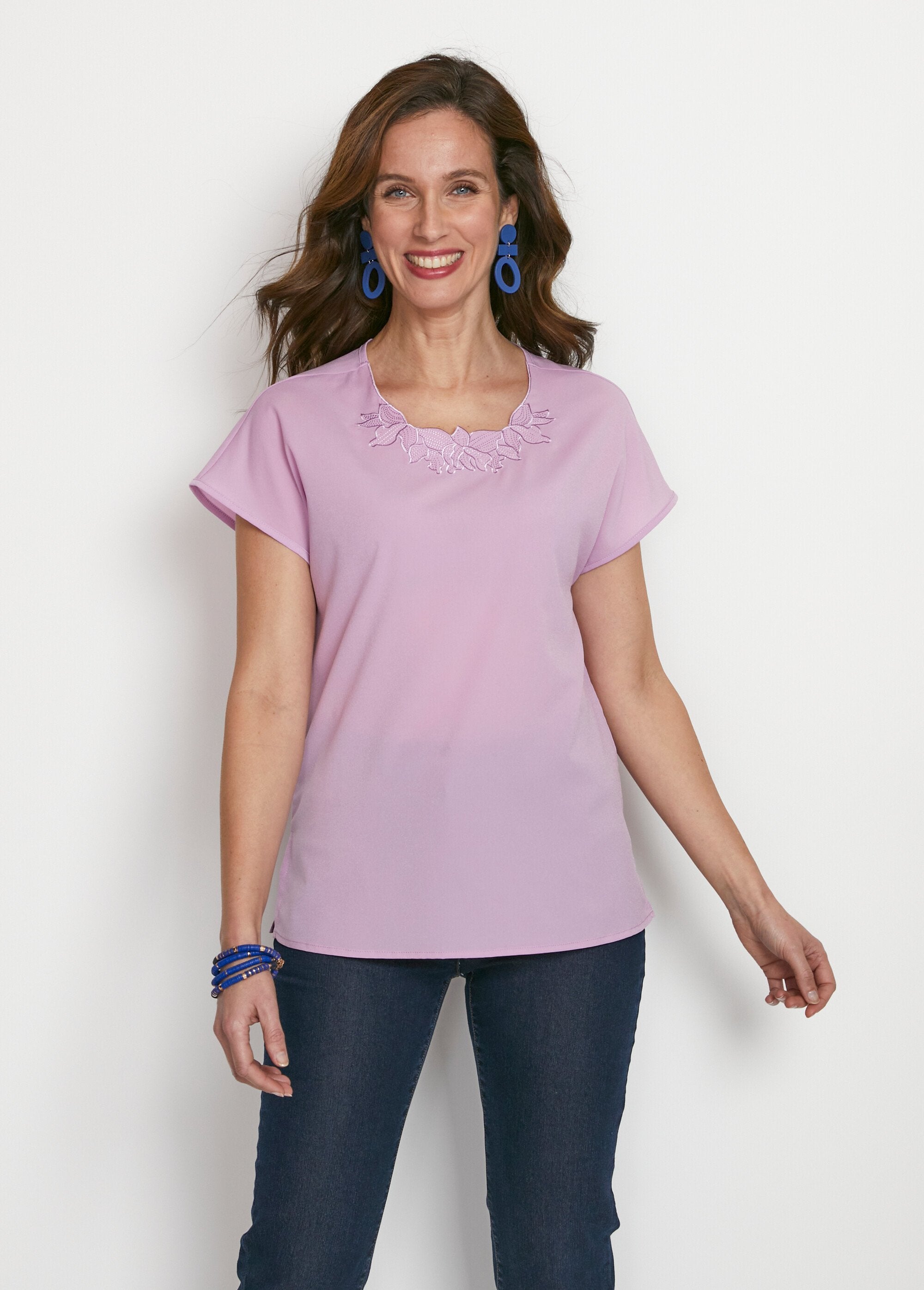 Top_largo_de_manga_corta_con_bordado_de_cuello_redondo_Lila_FA1_slim Top_largo_de_manga_corta_con_bordado_de_cuello_redondo_Lila_DO1_slim