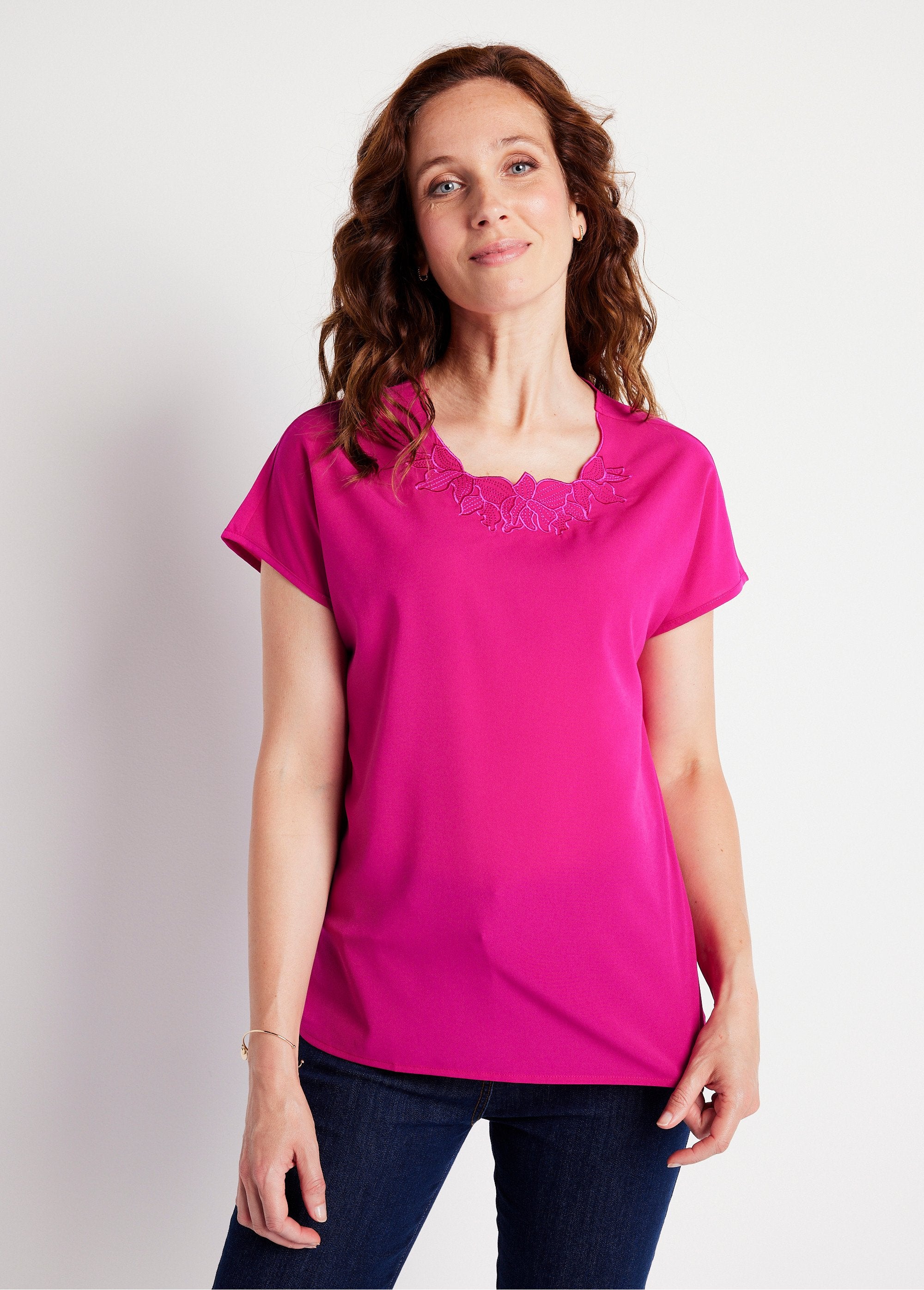 Top_largo_de_manga_corta_con_bordado_de_cuello_redondo_Fucsia_FA1_slim Top_largo_de_manga_corta_con_bordado_de_cuello_redondo_Fucsia_FA2_slim