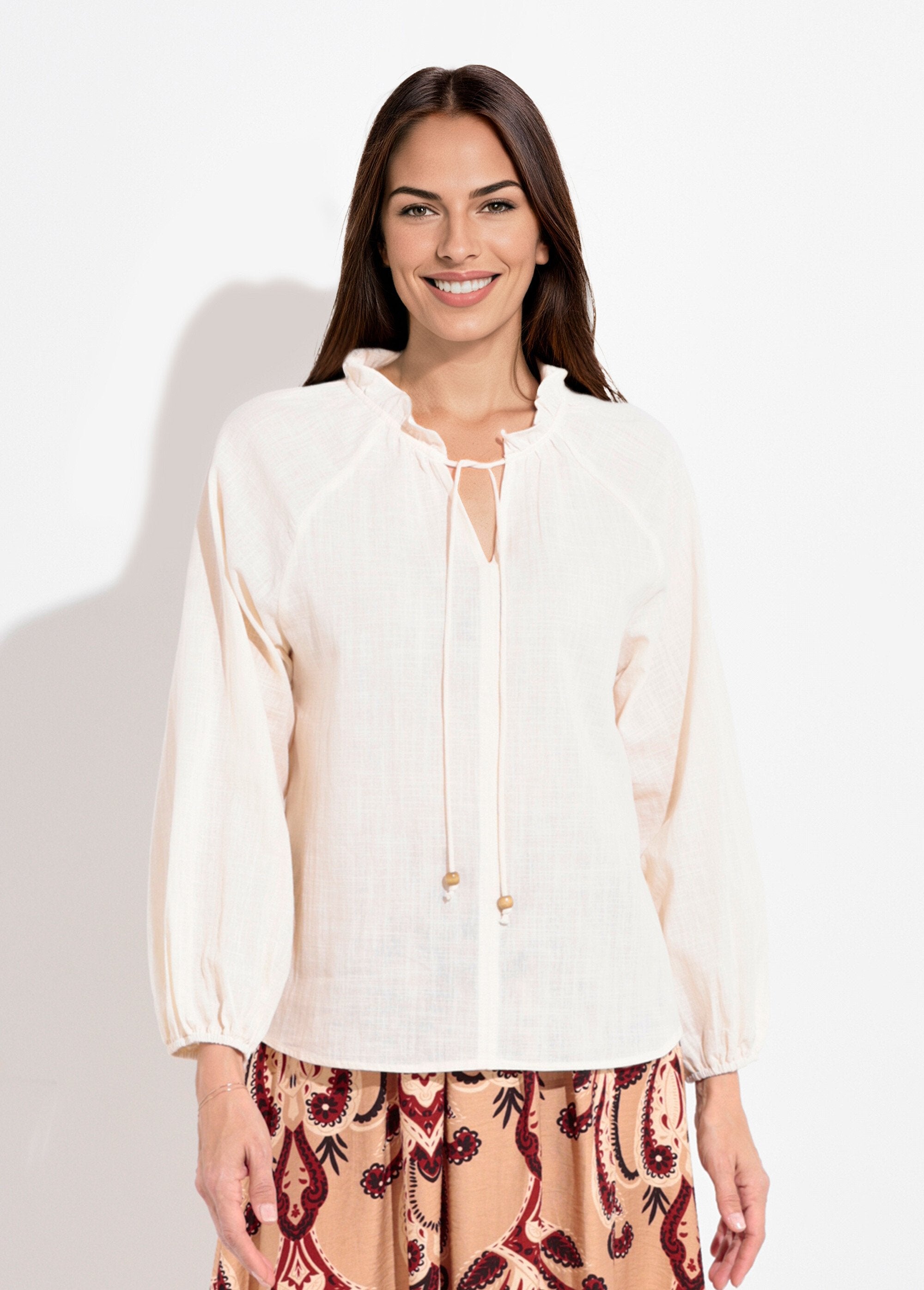 Blusa_holgada_con_cuello_en_V_y_lazo_Beige_FA1_slim Blusa_holgada_con_cuello_en_V_y_lazo_Beige_DO1_slim