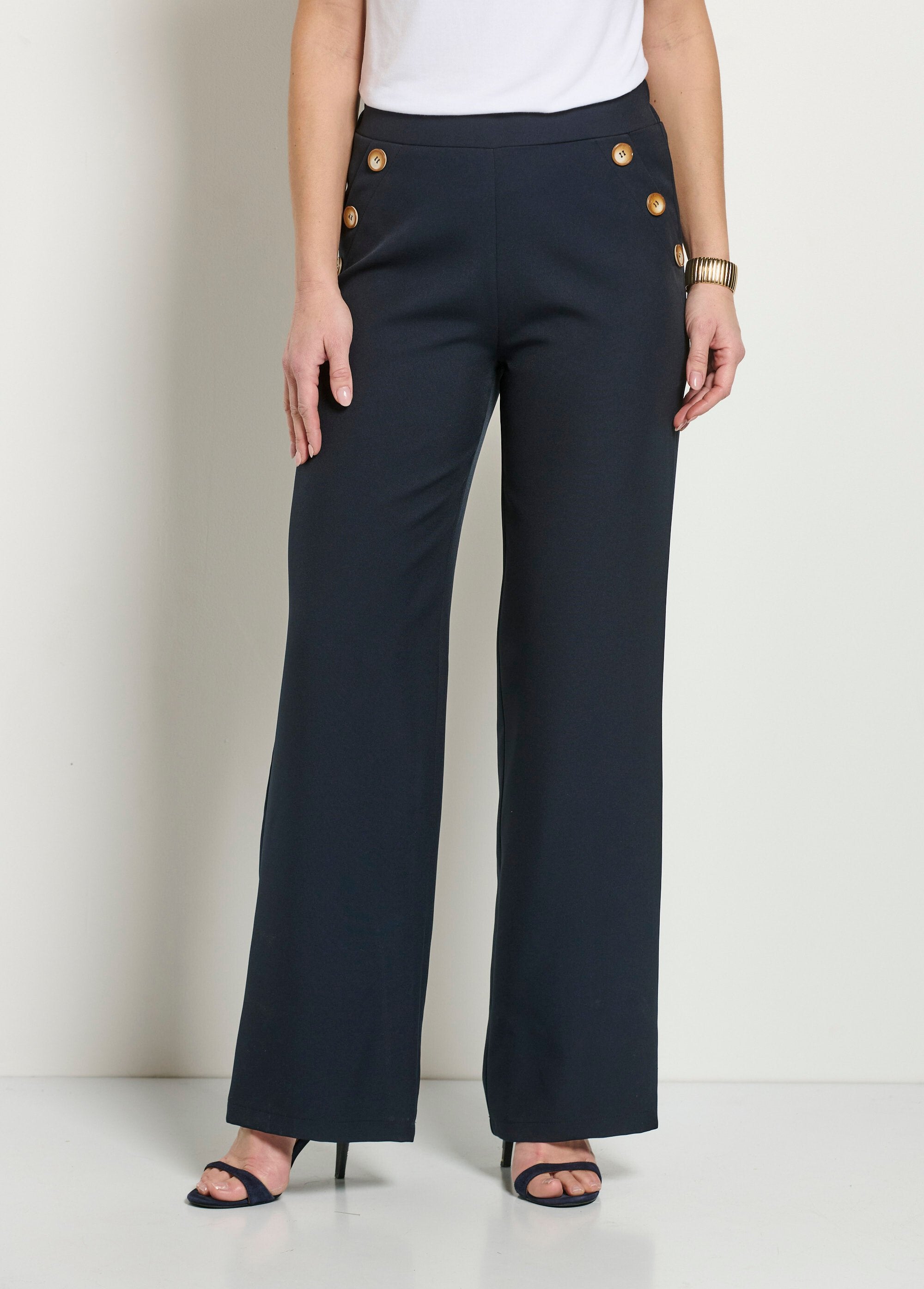 Con su cómodo tejido elástico y su línea ancha y fluida, estos pantalones de mujer proporcionan un look impecable durante todo el día. Para mayor comodidad, su cinturón plano en la parte delantera es elástico en la parte trasera. Para darle más estilo, sus bolsillos falsos italianos están realzados con 3 elegantes botones. Fabricación francesa.
